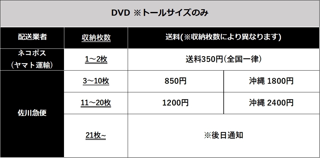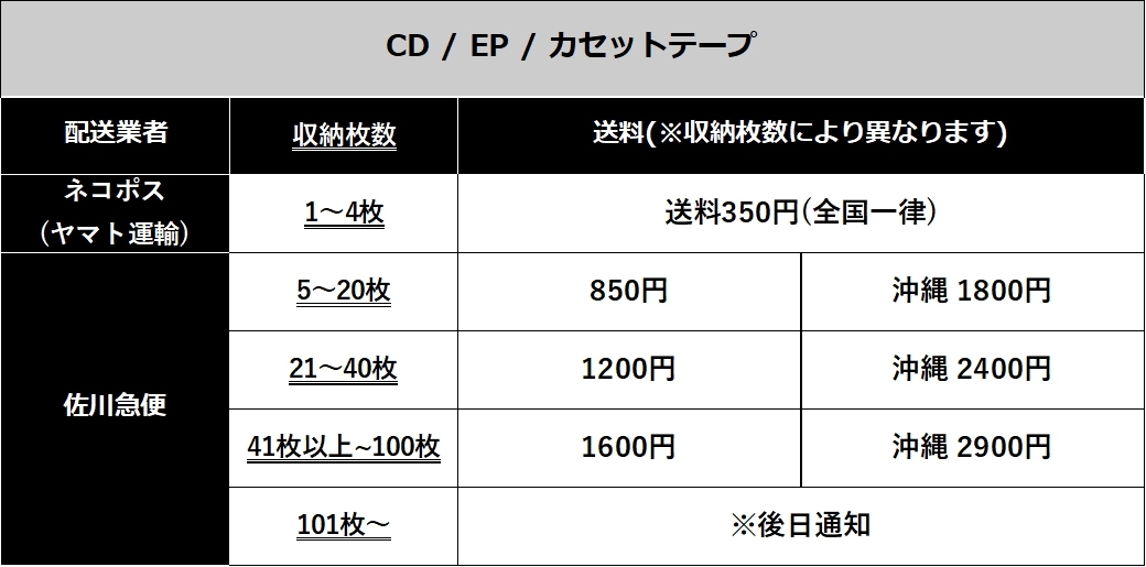 ■弊社を初めてご利用頂くお客様は必ず商品ページ等に記載がある以下の①~③までの項目をご一読くださいますようお願いいたします。 ①【まとめて購入手続きについて】 ②【各送料について】 ③【ご利用時の注意事項】 ■『CD/DVD/EPなどをご落札のお客様へのお知らせ』 ネコポス発送可能なCD等の商品を複数点ご落札いただいた際、合計収納枚数が5枚以上の場合、【まとめて購入手続きする】をクリック後、 ヤフオクの仕様により配送方法選択欄に【ヤマト運輸ネコポス】が選択可能ではございますが、 実際の発送につきましては【佐川急便】による発送となりますので、ご注意ください。 ご不明な点がございましたら、ご連絡ください。 ※CDとLP/12inchとの同梱はできません。 ※CDとEP、7inch商品御落札の際は同梱可) ※収納枚数100枚以上の際は、後日通知させて頂きます。 ※収納枚数によって配送業者、送料が異なります。 ※ネコポスの際はポスト投函により配達完了となります。 ※御落札頂いた商品につきましては、直接お渡しでの対応は出来かねますのでご了承ください。 ・DVDはトールサイズケースの商品のみ、サイズの都合上2枚分とカウントいたします。 ・CD-BOXとの同梱包の場合、収納枚数でのカウントとなります。 ・CD-BOXで収納枚数4枚以下でもコンディション詳細欄に以下の記載がある場合は佐川急便での発送となり、送料800円となります。 【こちらの商品ネコポス発送不可商品です。】 ・CDと同じサイズのケースのDVDは、CDの送料が適用されます。 ・トールケースDVD1枚とCD3枚同梱包の場合は、佐川急便で送料800円となります。 ■ネコポス対応商品の可否に関しましては、商品詳細欄に以下①②の記載がございます。 ①【こちらの商品はネコポス発送可能商品です。】 ②【こちらの商品ネコポス発送不可商品です。ご注意ください。】