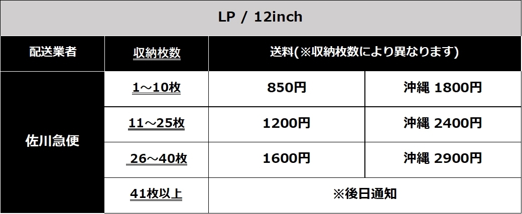 【取り置き】 ■弊社では最初の御落札から原則5日間を取り置き期間とさせて頂いております。 【同梱包】 同梱包の例をいつくか記載させていただきます。 ・CD商品の場合→EP、7inch商品との同梱可 ※LP/12inchとの同梱不可 ・LP商品の場合→EP、7inch商品との同梱可 ※CD/カセットテープ/DVDとの同梱不可 ・EP/7inch商品の場合→LP/12inch、CD/カセットテープ/DVDいずれの商品との同梱可 ・複数箱のセット商品の場合→単品での出品商品との同梱不可 |